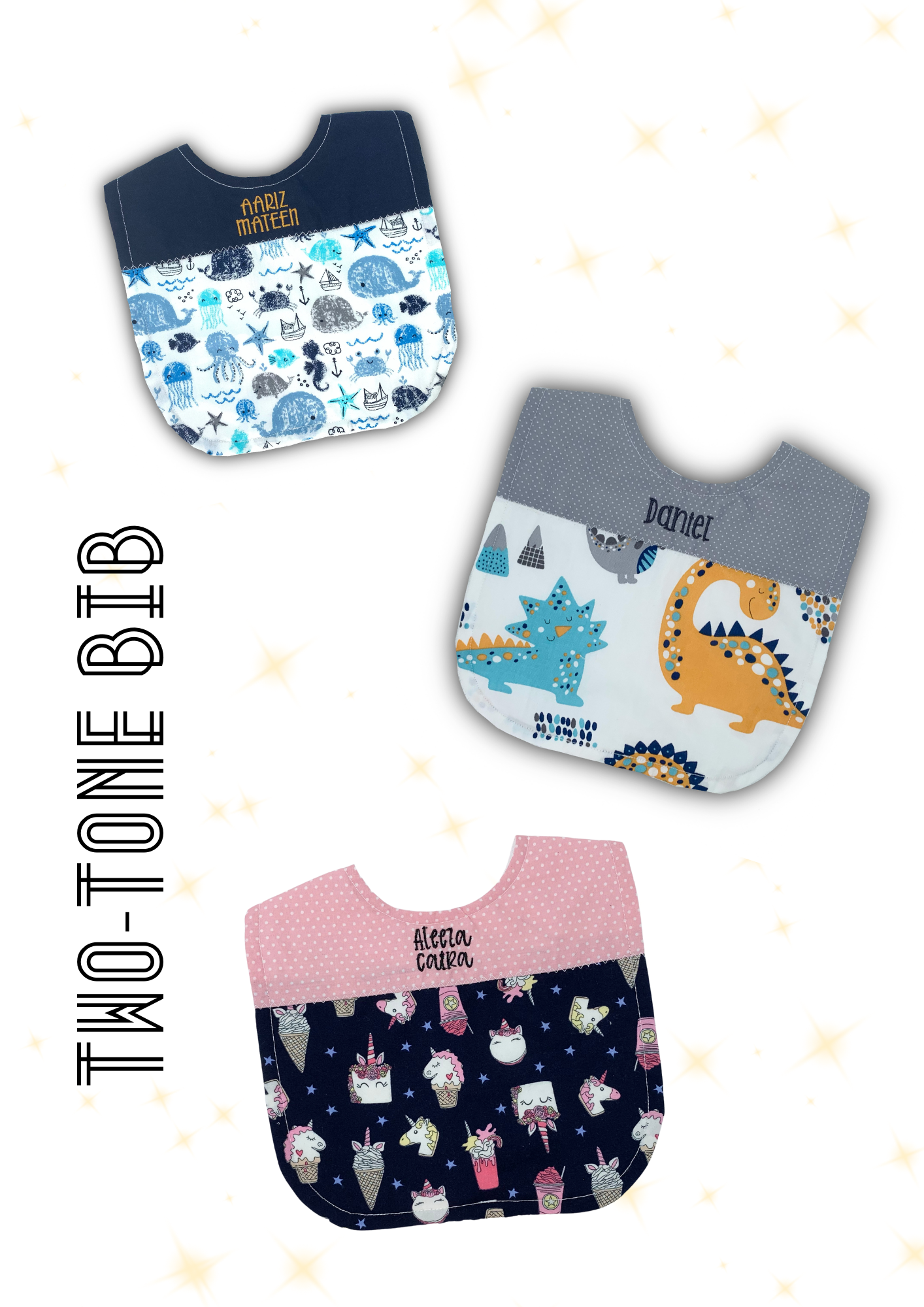 Polkadot Fabric / PlainFabric on the top, Base Fabric on the bottom to create a Two-Tone Series bib.